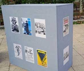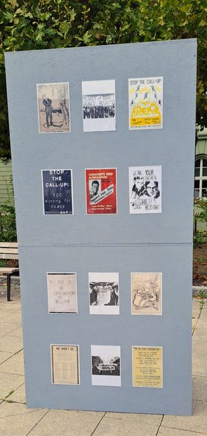 Es widmet sich Menschen, die den Kriegsdienst verweigern oder desertieren aus religiösen, ethischen, politischen oder anderen Gründen. Oft geschieht das anonym. Dieses Denkmal macht sichtbar, dass diese Entscheidungen Teil einer langen und internationalen Geschichte sind. Die Plakate auf der Oberfläche stammen aus unterschiedlichen Kontexten: aus Kanada, wo während des Vietnamkriegs Deserteure Zuflucht fanden; aus Südafrika, wo die End Conscription Campaign in den 1980er Jahren aktiv war; aus antimilitaristischen Protesten in Deutschland und Europa im 20. Jahrhundert; und aus aktuellen Initiativen wie der #ObjectWar Campaign, die Deserteure in Russland, Belarus und der Ukraine unterstützt. Die Form ist bewusst schlicht gehalten: gestapelte Quader, grau gestrichen, ohne Monumentalgestus. Im Kontrast zum Kriegerdenkmal, das das Sterben für das Land normalisiert, entsteht hier eine andere Art von Denkmal: nicht zur Glorifizierung, sondern zur Sichtbarmachung von Verweigerung und zur Solidarisierung mit den Verweigernden.