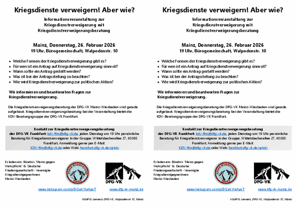 Eine weitere Veranstaltung zur Kriegsdienstverweigerung: Bundeswehr-Brief: Was jetzt? Interaktiver Workshop mit Raum für Input, Q&A und Organizing Freitag, 6. März 2026, 17 Uhr WIESBADEN-Biebrich, Bürgerhaus Galatea-Anlage, Straße der Republik 17-19