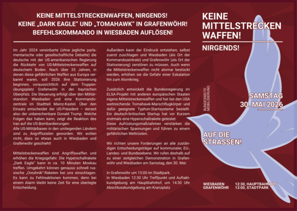 Im Jahr 2024 vereinbarte (ohne jegliche parlamentarische oder gesellschaftliche Debatte) die deutsche mit der US-amerikanischen Regierung die Rückkehr von US-Mittelstreckenwaffen auf deutschem Boden. Nach über 35 Jahren, in denen diese gefährlichen Waffen aus Europa verbannt waren, soll 2026 ihre Stationierung beginnen, voraussichtlich auf dem Truppenübungsplatz Grafenwöhr in der bayrischen Oberpfalz. Die Steuerung erfolgt über den Militärstandort Wiesbaden und eine Kommandozentrale im Stadtteil Mainz-Kastel. Über den Einsatz entscheidet der US-Präsident – also derzeit der unberechenbare Donald Trump. Welche Folgen das haben kann, zeigt die Reaktion des Iran auf die US-Bombardierungen: Alle US-Militärbasen in den umliegenden Ländern sind zu Angriffszielen geworden. Wir wollen nicht, dass so etwas auch in Wiesbaden und Grafenwöhr geschieht!